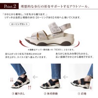 ●バックストラップで歩行中も脱げにくく、ウェッジヒールのため足が疲れにくい。